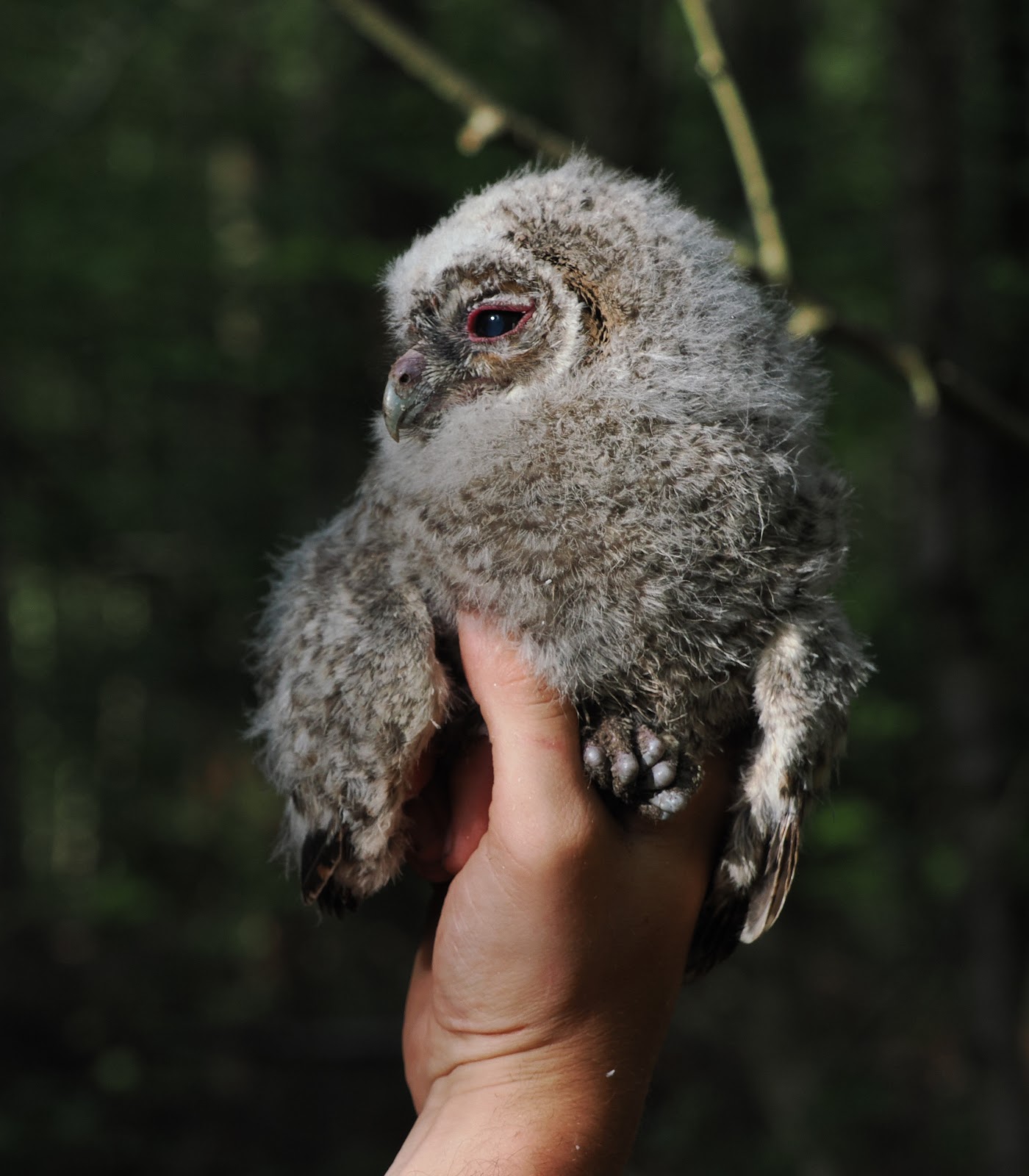 The two healthy looking owlets were ringed this week, taken out of the box and carefully replaced back inside afterwards. They will soon be gone. Tawny owlets "branch", they leave the nest before their flight feathers are fully developed and move around the branches of trees where the adults will continue to feed them until they are old enough. With luck they will get to raise another generation of owls, in time, in our wood.